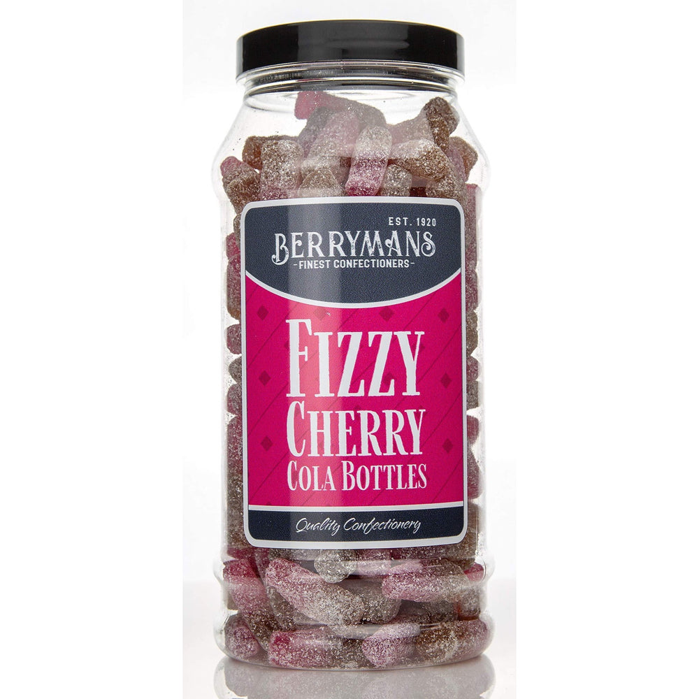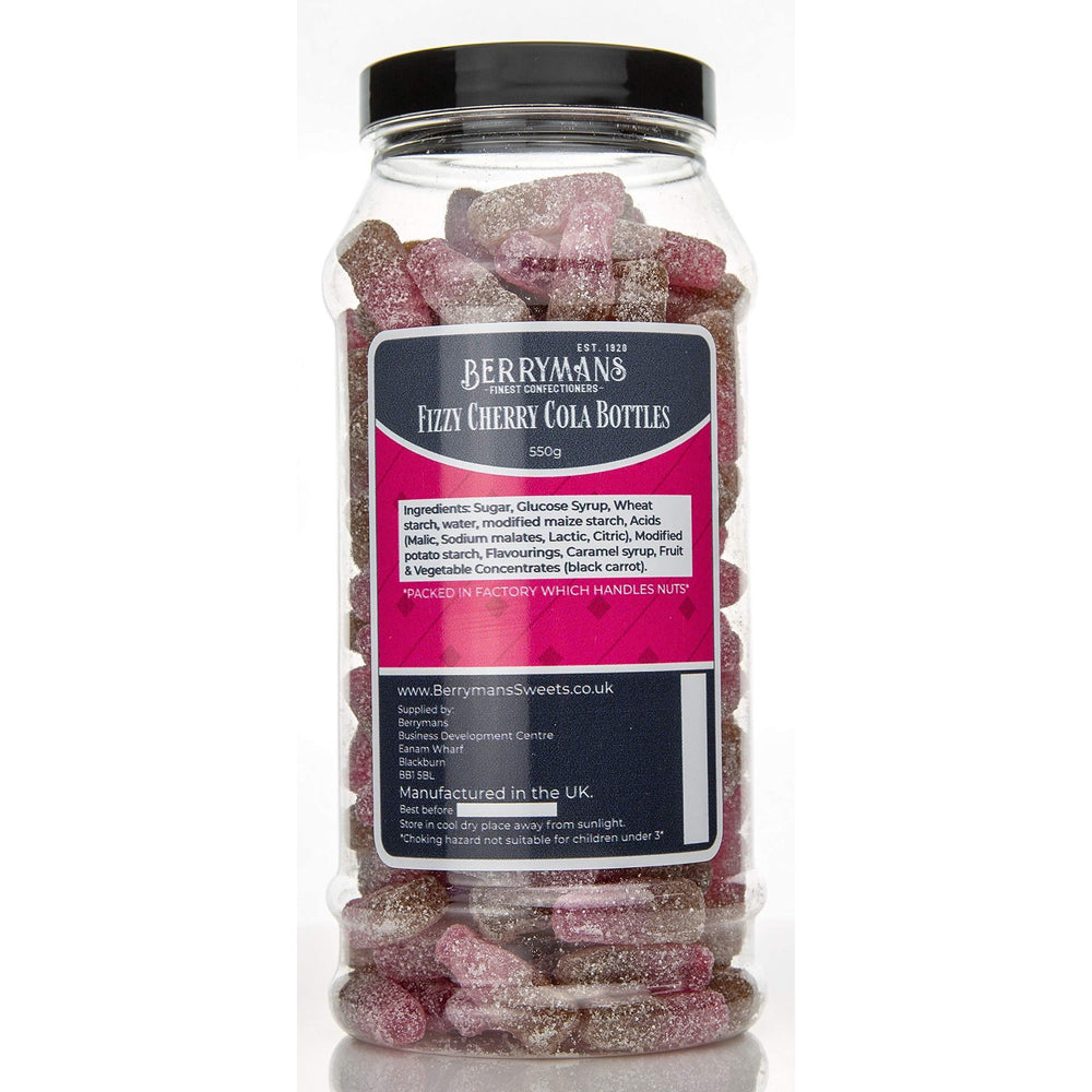 When you want nothing but the fizziest, sourest, most flavoursome fizzy cherry cola bottles, head to Berrymans, where our confectionery experts have worked their magic to recreate this perfect nostalgic treat from your childhood. Our fizzy cherry cola bottles are the real deal; cherry and cola flavour bottles with a sour coating and a wonderfully fizzy sugar layer to top off the treat. Even better, our fizzy cherry cola bottles are gelatine-free, dairy-free and 100% vegan! If you love fizzy cherry cola bottles, why not try our fizzy cola bottles and fizzy bubblegum bottles to recreate those blissful childhood pick 'n mix experiences? You'll love Berrymans sweets for their wonderful flavour and authenticity - our nostalgic sweets are made from real ingredients, and our Lancashire factory features huge copper pots of bubbling sugar, creating authentic sweets that really pack a punch!